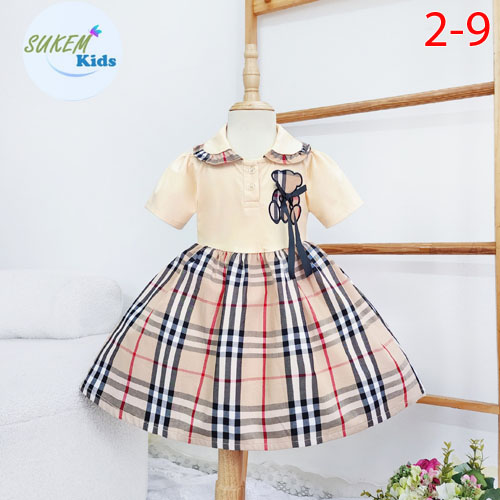 A343494 - Đầm may cổ bẻ nhún bèo thêu đắp gấu đính nơ 1 bên thun coton kết hợp với vải burberry_Size