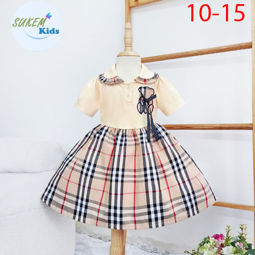 A343497 - Đầm may cổ bẻ nhún bèo thêu đắp gấu đính nơ 1 bên thun coton kết hợp với vải burberry_Size