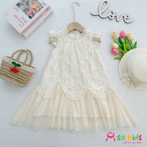 A352660 - Đầm xòe tơ thêu Nơ to cho bé gái phối Tùng lưới trơn 2 lớp tay tiên và cổ phối tơ trơn_Siz