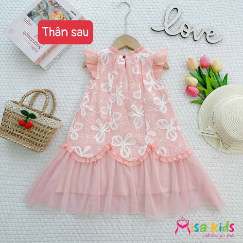 A352661 - Đầm xòe tơ thêu Nơ to cho bé gái phối Tùng lưới trơn 2 lớp tay tiên và cổ phối tơ trơn_Siz