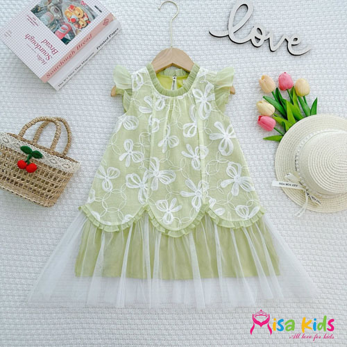 A352662 - Đầm xòe tơ thêu Nơ to cho bé gái phối Tùng lưới trơn 2 lớp tay tiên và cổ phối tơ trơn_Siz