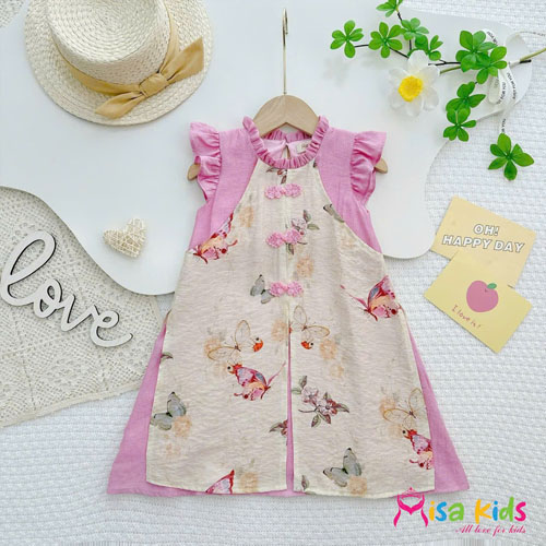 A355786 - Đầm tơ babydoll xòe phối tay tiên, cổ nhún bèo trước gắn 3 nút tàu_Size 1-10
