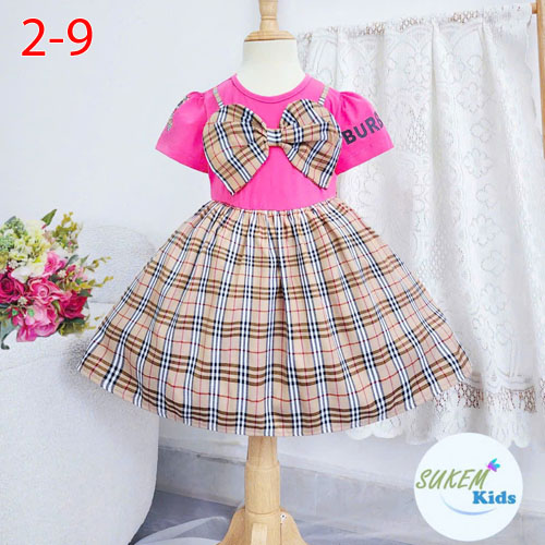 A373828 - Đầm may giả yếm Nơ to siêu cute áo ngắn tay in burberry phối vải thun coton_Size 2-9