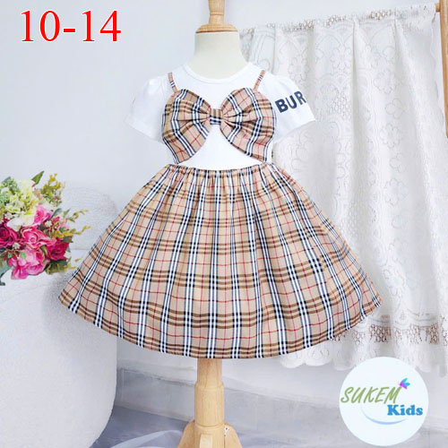 A373835 - Đầm may giả yếm Nơ to siêu cute áo ngắn tay in burberry phối vải thun coton_Size 10-14