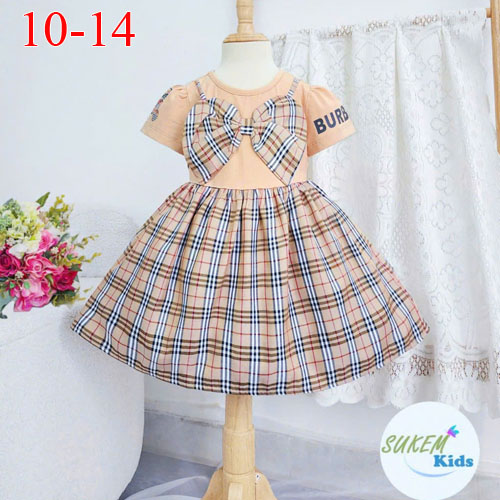 A373837 - Đầm may giả yếm Nơ to siêu cute áo ngắn tay in burberry phối vải thun coton_Size 10-14
