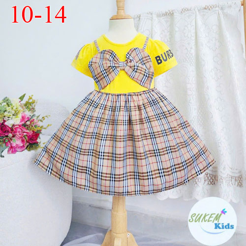 A373839 - Đầm may giả yếm Nơ to siêu cute áo ngắn tay in burberry phối vải thun coton_Size 10-14