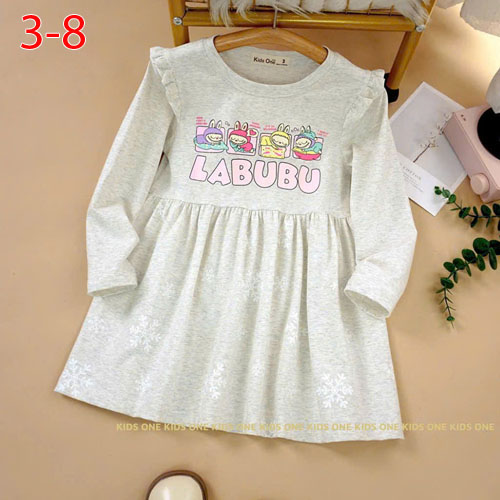 A379028 - Đầm thun cổ tròn dài tay thân trên in hình LABUBU tùng in hình bông tuyết_Size 3-8