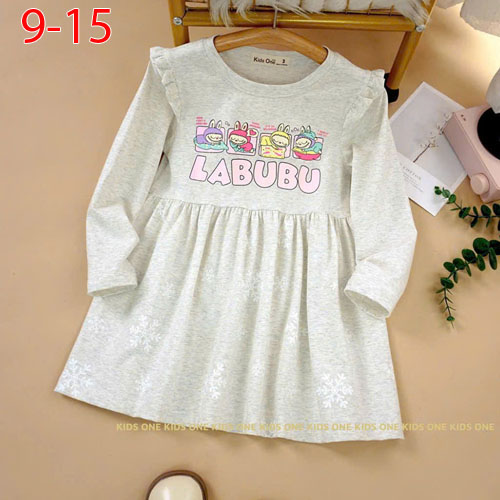 A379031 - Đầm thun cổ tròn dài tay thân trên in hình LABUBU tùng in hình bông tuyết_Size 9-15