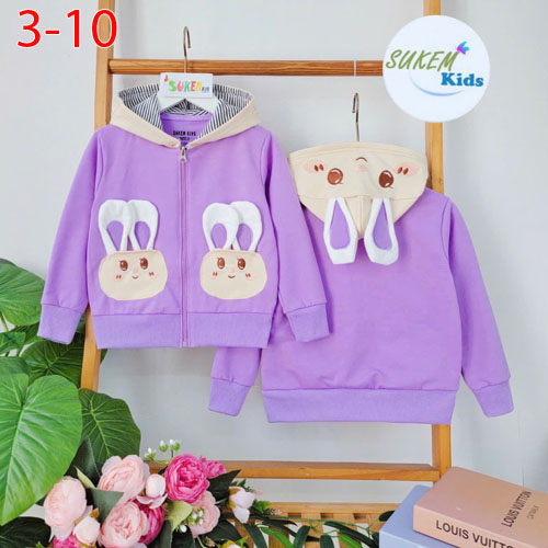 A381552 - Áo khoác bé gái đắp túi thỏ 2 bên may Nón có đắp tai thỏ bông xù 2 bên_Size 3-10