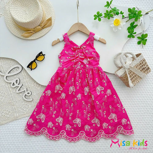 A389022 - Đầm thô cotton thêu BƯỚM cho bé gái phần ngực nhún nơ, lưng khoét gắn nơ Tùng có chân ren_