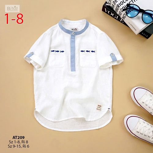 A393913 - Áo sơ mi cổ trụ, tay ngắn, thiết kế cách điệu với 2 túi có hình thêu chất liệu caro - sô c