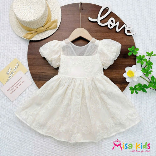 A394919 - Đầm xòe tơ thêu hoa phối ngực và nơ lưới trơn tay phồng lót lụa nguyên thân_Size 1-10