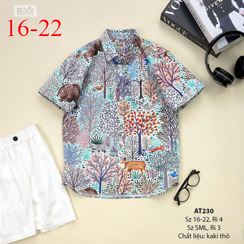 A399257 - Áo sơ mi tay ngắn, hoạ tiết rực rỡ sô lụa, si cotton hoặc kaki thô cho bé trai_Size 16-22