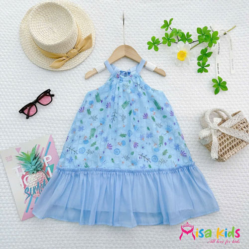 A401672 - Đầm tơ in hoa phối tơ trơn, lót lụa nguyên đầm dáng xòe, cổ yếm , cột dây nơ_Size 1-10