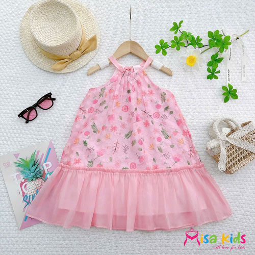 A401673 - Đầm tơ in hoa phối tơ trơn, lót lụa nguyên đầm dáng xòe, cổ yếm , cột dây nơ_Size 1-10