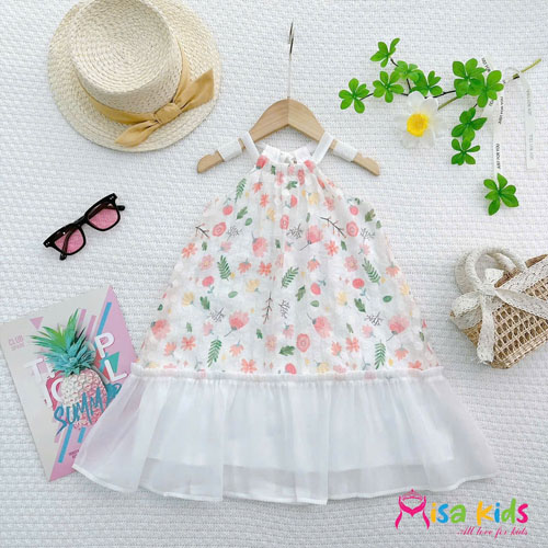 A401675 - Đầm tơ in hoa phối tơ trơn, lót lụa nguyên đầm dáng xòe, cổ yếm , cột dây nơ_Size 1-10