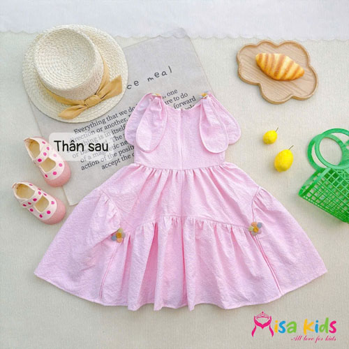 A403735 - Đầm xòe xốp kim cương siêu xinh cho bé gái lót lụa phần vai gắn tai thỏ tùng gắn hoa phụ k