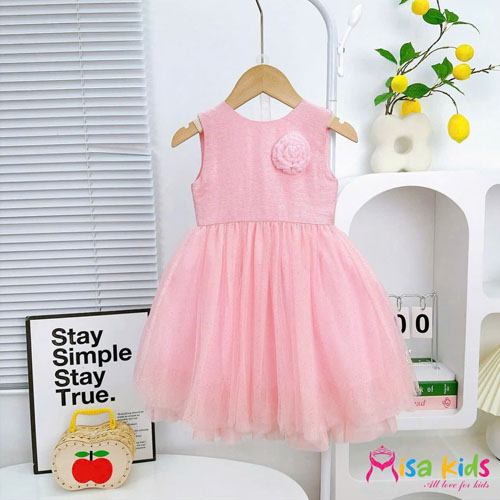 A411699 - Đầm xòe sát nách gắn hoa dễ thương hân trên tapta xước ánh kim , thân dưới 1 lớp lưới kim
