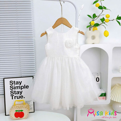 A411700 - Đầm xòe sát nách gắn hoa dễ thương hân trên tapta xước ánh kim , thân dưới 1 lớp lưới kim