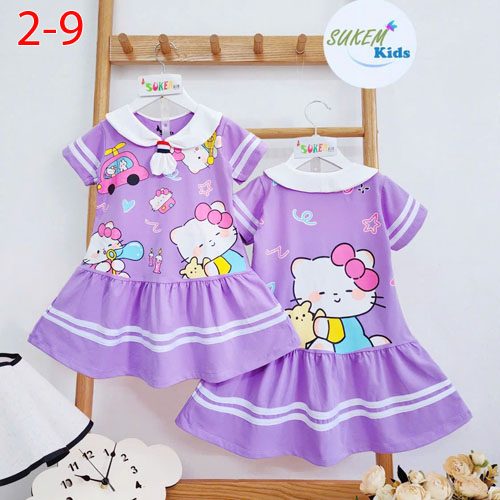 A416006 - Đầm thun cổ thủy thủ xinh in phun đầm họa tiết ép kitty cute may xếp ly đuôi cá chạy dây v