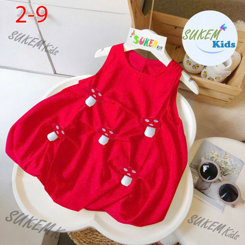 A416227 - Đầm may nhún ly tùng bí 2 lớp đính cây nấm và chú vịt bông vải thun cotton_Size 2-9