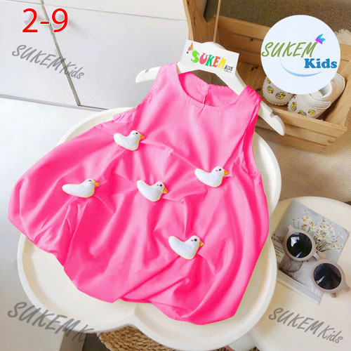 A416230 - Đầm may nhún ly tùng bí 2 lớp đính cây nấm và chú vịt bông vải thun cotton_Size 2-9