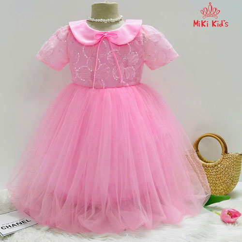 A417435 - Đầm bé gái thiết kế 4 lớp may lộn viền lớp lưới ren hoa nổi chất ren tơ mix luới kim tuyến