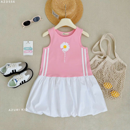 A418639 - Đầm thun hoa DAISY sát nách mát mẻ, phom váy quả bí may dây sọc trang trí sườn áo_Size 2-1