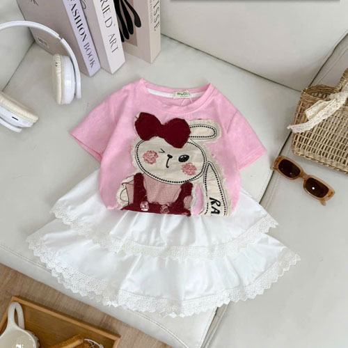 A427252 - Sét bộ váy loang hình thêu đắp thỏ,Kitty áo thun chân váy kate 2 tầng kèm chíp trong_Size