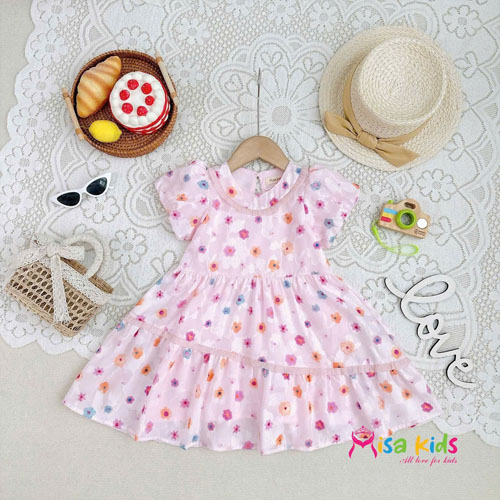 A432070 - Đầm xòe tơ in hoa cổ và tùng chạy bèo tơ trơn, tay phồng, lót lụa nguyên thân_Size 1-10
