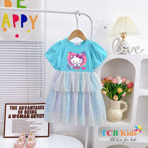 A447510 - Đầm thun phối lưới kim tuyến in KITTY bé gái_Size 1-10