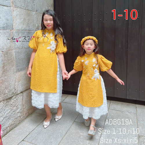 A455235 - Set áo dài bé gái gấm xốp tay bồng in Bạch Ngọc Hoa chân váy ren tầng bồng bềnh_Size 1-10