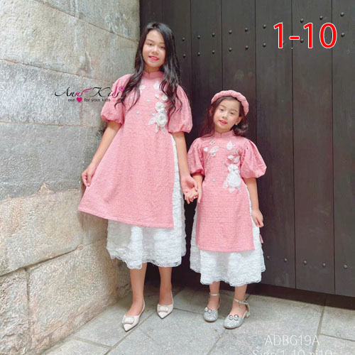 A455236 - Set áo dài bé gái gấm xốp tay bồng in Bạch Ngọc Hoa chân váy ren tầng bồng bềnh_Size 1-10