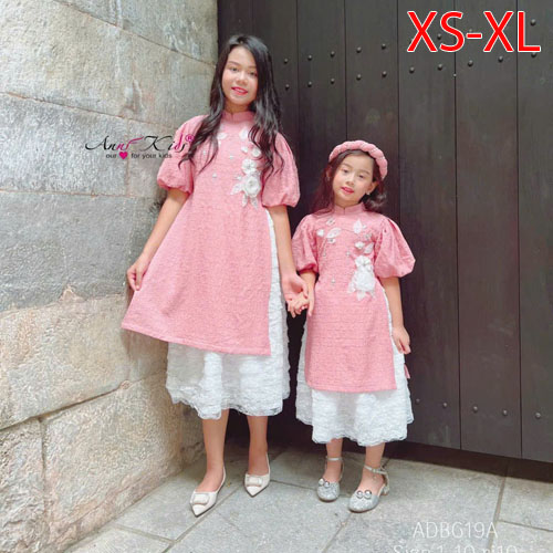 A455239 - Set áo dài bé gái gấm xốp tay bồng in Bạch Ngọc Hoa chân váy ren tầng bồng bềnh_Size XS-X