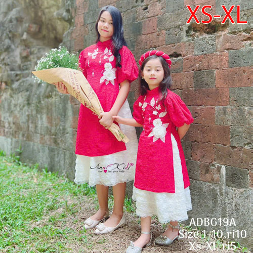 A455241 - Set áo dài bé gái gấm xốp tay bồng in Bạch Ngọc Hoa chân váy ren tầng bồng bềnh_Size XS-XL