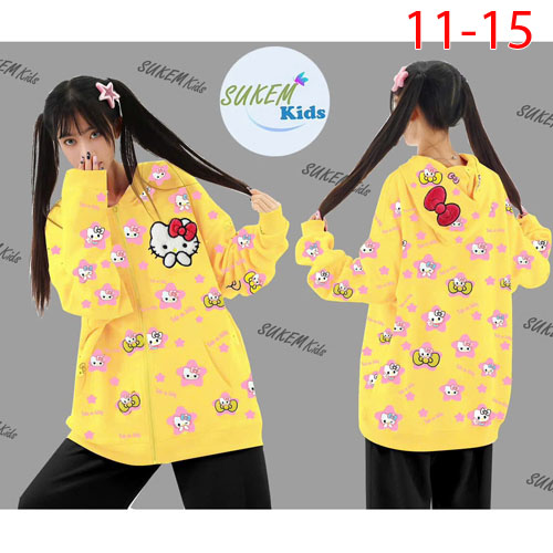 A455669 - Áo khoác Kitty trước sau may nón thêu đắp bông xù in Kitty chất Da cá coton 4c_Size 11-15