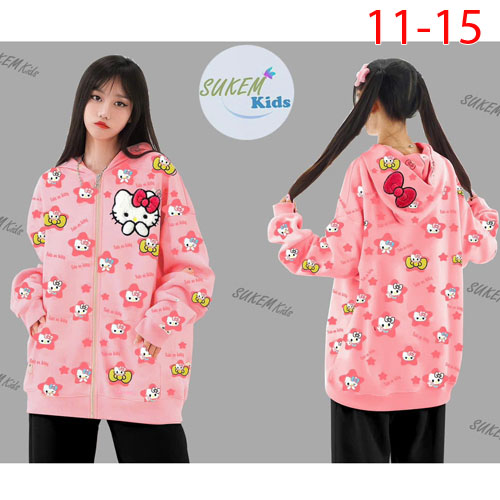 A455670 - Áo khoác Kitty trước sau may nón thêu đắp bông xù in Kitty chất Da cá coton 4c_Size 11-15