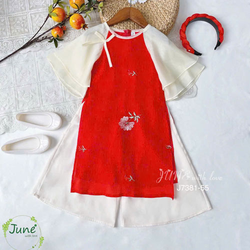 A459395 - Áo dài truyền thống với hoạ tiết hoa thêu cổ tròn cách điểm nơ chất liệu tơ thêu cùng lụa