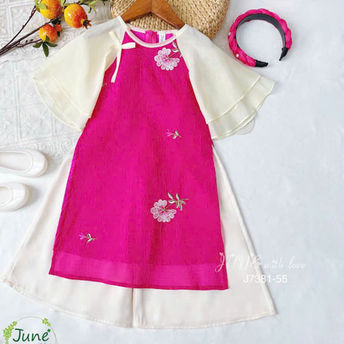 A459396 - Áo dài truyền thống với hoạ tiết hoa thêu cổ tròn cách điểm nơ chất liệu tơ thêu cùng lụa