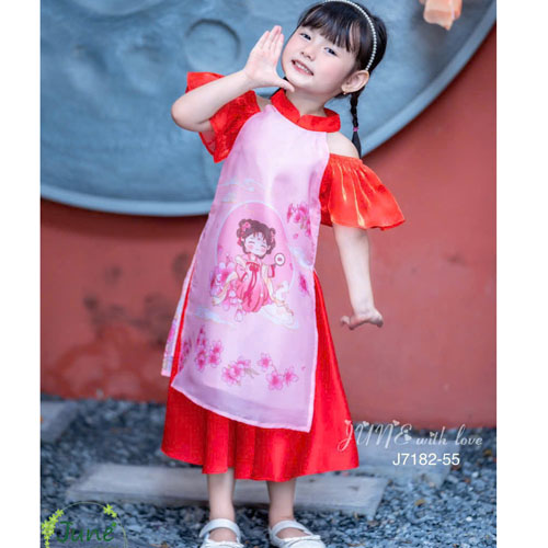 A459403 - Set áo dài với hoạ tiết Tiên nữ giáng trần cổ yếm cut out chất liệu tơ ngọc trai_Size 1y-1