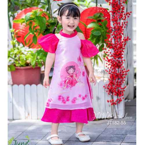 A459404 - Set áo dài với hoạ tiết Tiên nữ giáng trần cổ yếm cut out chất liệu tơ ngọc trai_Size 1y-1