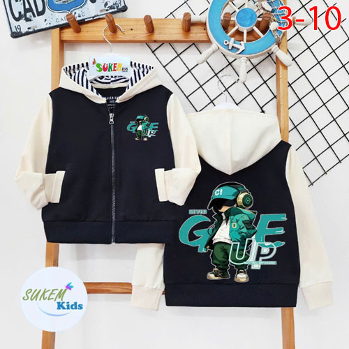 A459794 - Áo khoác bé trai phối tay ráp lăng với nón phối mổ túi 2 bên ép hình cậu bé GIVE UP_Size 3