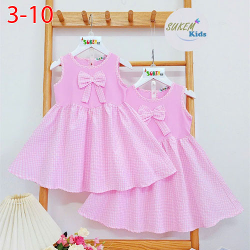 A460690 - Đầm may phối thun đính nơ karo cắt lượn sóng cool xịn tùng xòe nhún bồng bềnh_Size 3-10