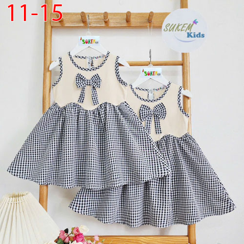 A460692 - Đầm may phối thun đính nơ karo cắt lượn sóng cool xịn tùng xòe nhún bồng bềnh_Size 11-15