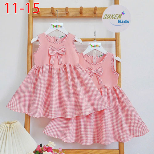 A460696 - Đầm may phối thun đính nơ karo cắt lượn sóng cool xịn tùng xòe nhún bồng bềnh_Size 11-15