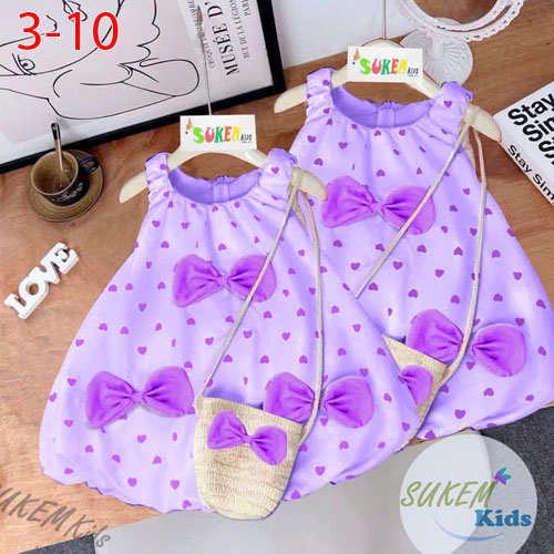 A462538 - (19/10)Đầm may nhún tùng bí 2 lớp đính Nơ vải cotton thái in cham trái tim_Size 3-10