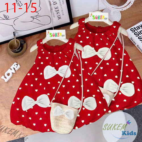 A462545 - (19/10)Đầm may nhún tùng bí 2 lớp đính Nơ vải cotton thái in cham trái tim_Size 11-15