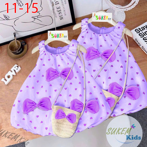 A462547 - (19/10)Đầm may nhún tùng bí 2 lớp đính Nơ vải cotton thái in cham trái tim_Size 11-15