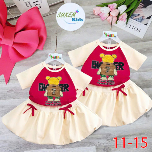 A462708 - (22/10)Set bí áo ngắn tay ráp lăng in gấu thể thao chất thun coton 4c in gấu số 7 chân váy