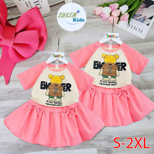 A462711 - (22/10)Set bí áo ngắn tay ráp lăng in gấu thể thao chất thun coton 4c in gấu số 7 chân váy